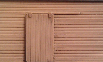 With the recent addition of some more paint, I went ahead and added the final touches to the door hardware on the storage shed. Using Flat Aluminium paint, I dripped the end of a fine brush into the cap for the jar, gathering up just a little paint. I then dragged it over the door railing and door hangers/clips, giving it just a touch of metal appearance.